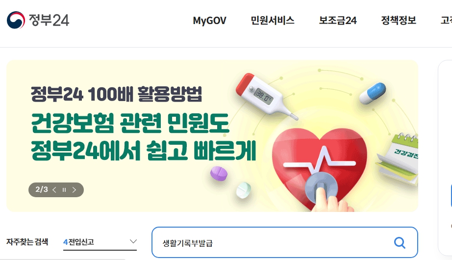 정부24 사이트 메인 화면 중간위치 검색창에 생활기록부발급 이라고 검색을 합니다.