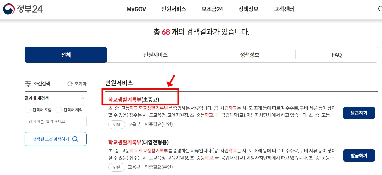 검색된 민원서비스 목록중에서 학생생활기록부(초중고) 검색결과를 선택하여 들어갑니다.