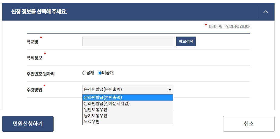 초중고를 선택하여 한가지씩 발급을 받을수 있습니다. 발급 수령방법에는 온라인 발급과, 우편 으로 나눠져 있습니다. 수령받기를 원하는 방법으로 선택하여 민원신청후 발급받을수 있습니다.