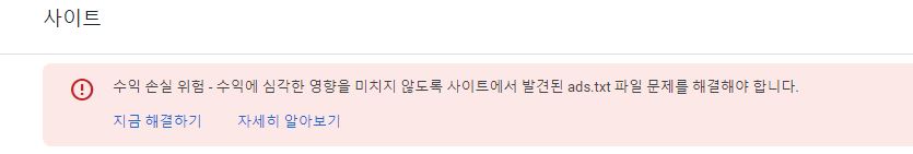 애드센스에 로그인을 하면 메인화면 상단에 아래와 같이 ads.txt 파일 문제를 해결해야 합니다. 라는 팝업창에 오류가 어느날 나타나게 됩니다. 수식 손실에 심각한 영향을 미칠수 있다라는 문구가 기재되어 있지만, 실질적으로 수익에 문제가 되지는 않습니다. 하지만 계속 떠있는 오류를 보기보단 지금 해결하기를 통해 해결해주는게 좋습니다.